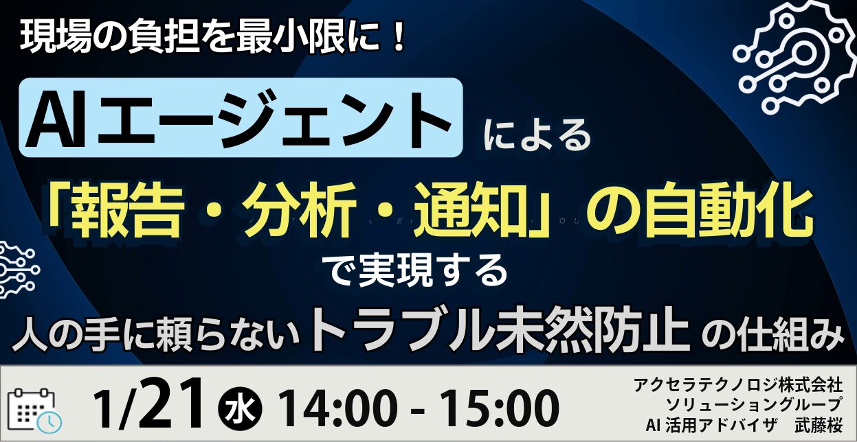 本セミナーでは、AIエージェントが現場に代わって動くことで、 再発防止のフローそのものを自動化する 「人の手に頼らないナレッジ活用」の形をご紹介します。
